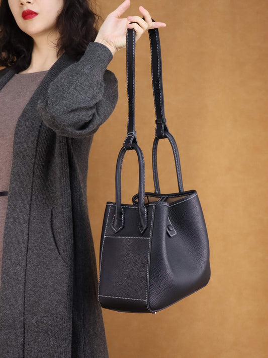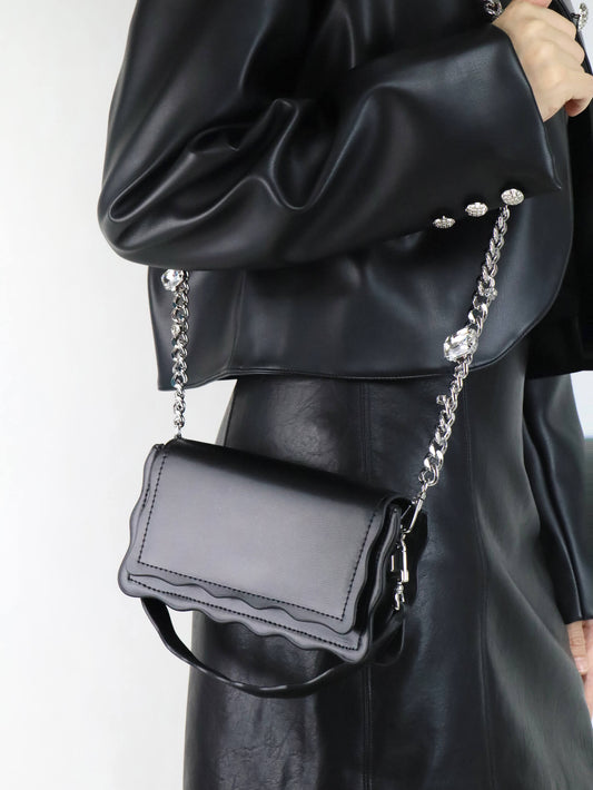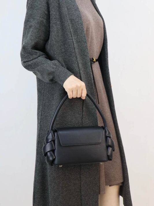 Luxury Black Leather Shoulder Bag + Relaxed Long Cardigan