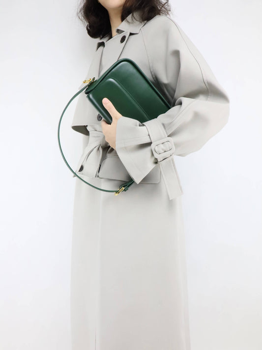 Green Leather Shoulder Bag & Crossbody Bag + Long Trench Coat for Women
