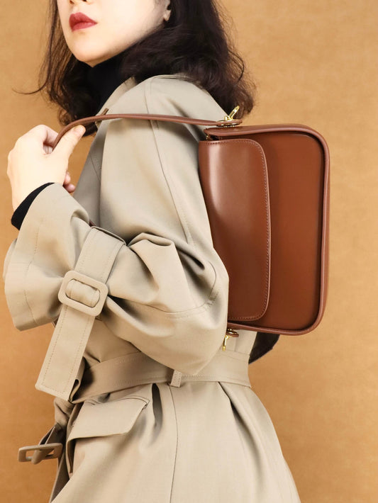 Brown Leather Shoulder Bag & Crossbody Bag + Khaki Long Trench Coat
