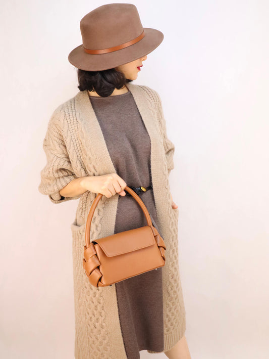 Luxury Beige Leather Shoulder Bag + Relaxed Long Chunky Cable Cardigan