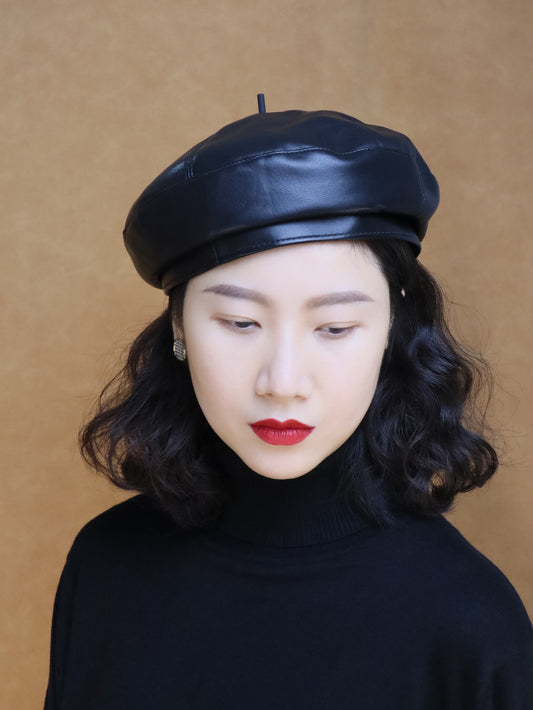 Black Leather Beret Hat for Women