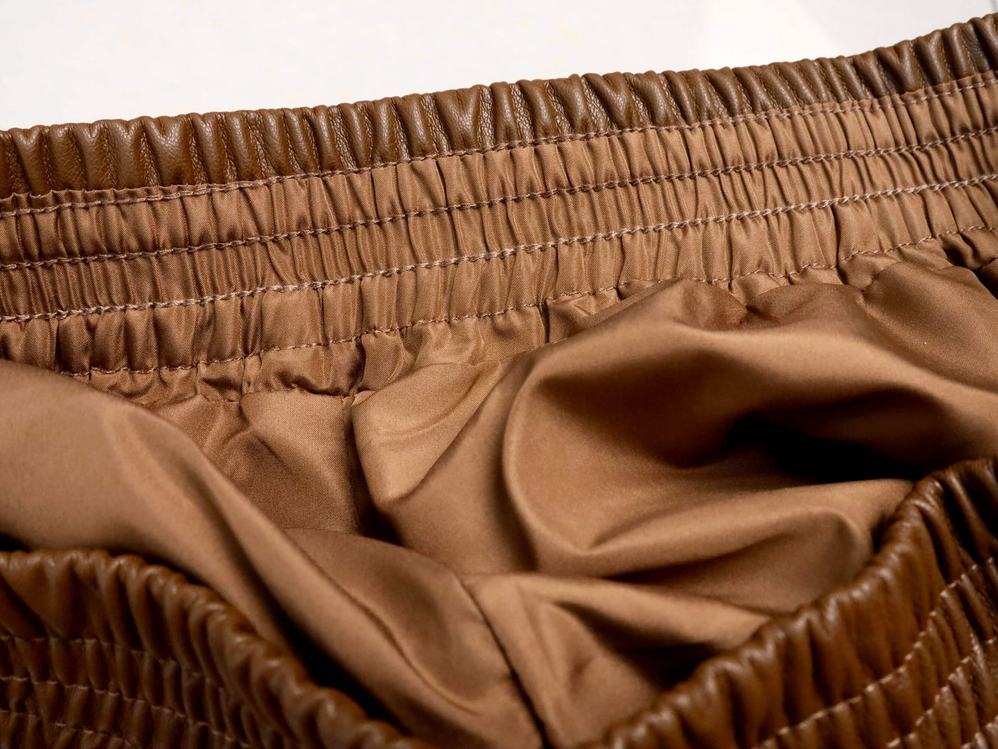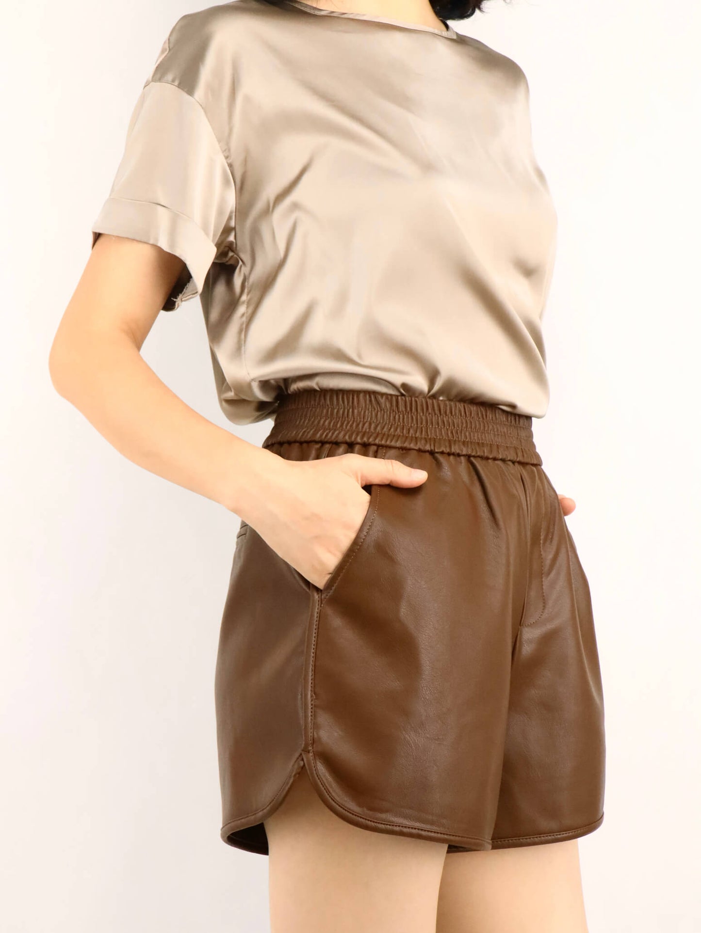 Leather shorts with elastic band design that can be more accommodating to the figure. Duo welt pockets. Soft PU leather fabric. Decorative pocket pattern on the back. Lining is included.